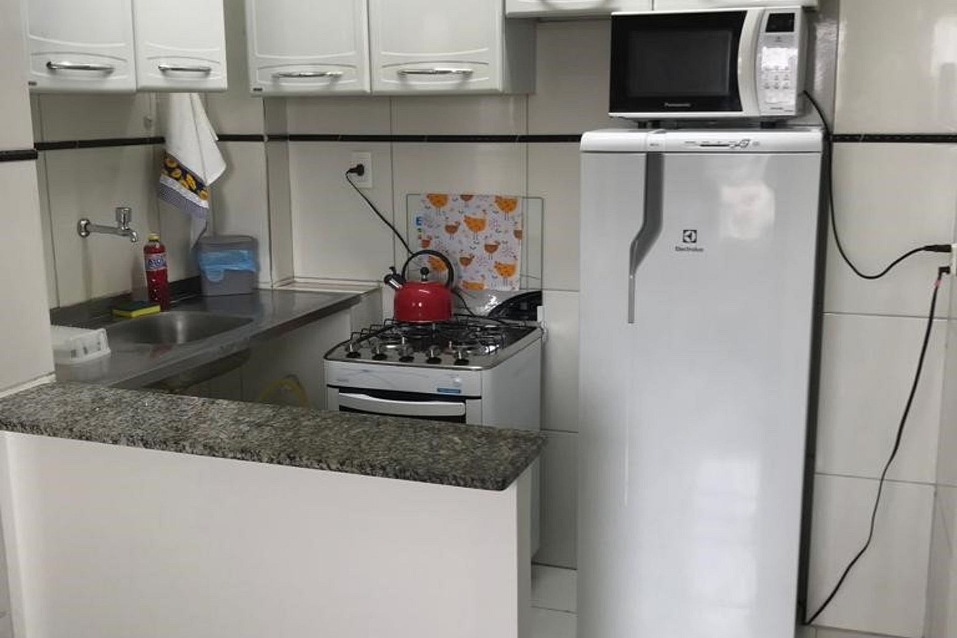 Na cozinha tem armários, geladeira, fogão e micro-ondas além de panelas e utensílios domésticos (talheres, xícaras, copos e pratos).